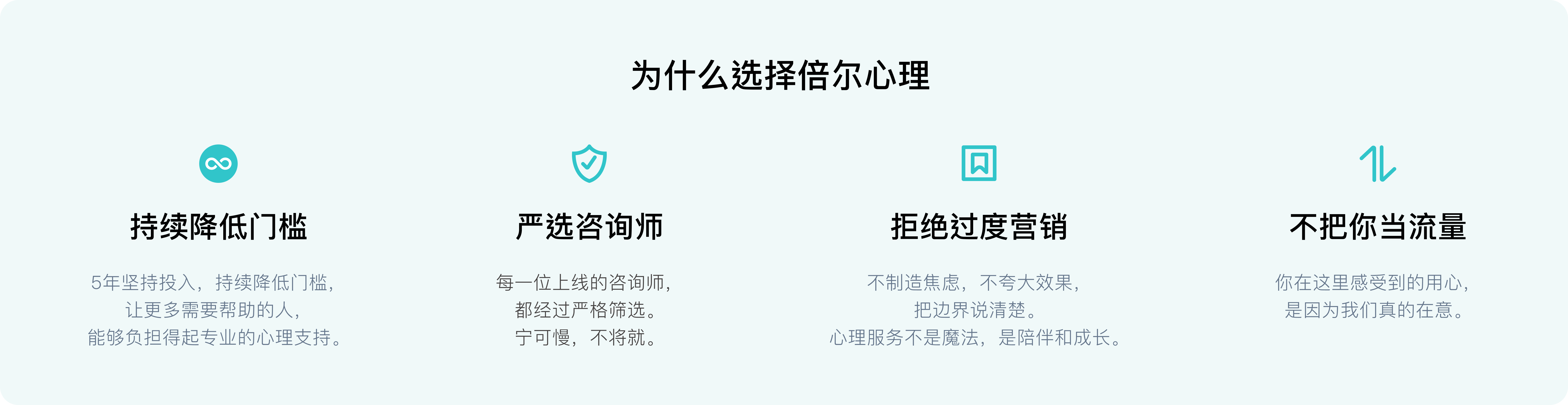 倍尔心理,是一个把“心理支持”做得更长期、更认真、更克制的平台。 我们相信,真正有用的心理服务,不是一次性情绪安抚,而是被认真对待、被持续支持。 爱自己,不是某个时刻的决定,而是每一天的选择。
